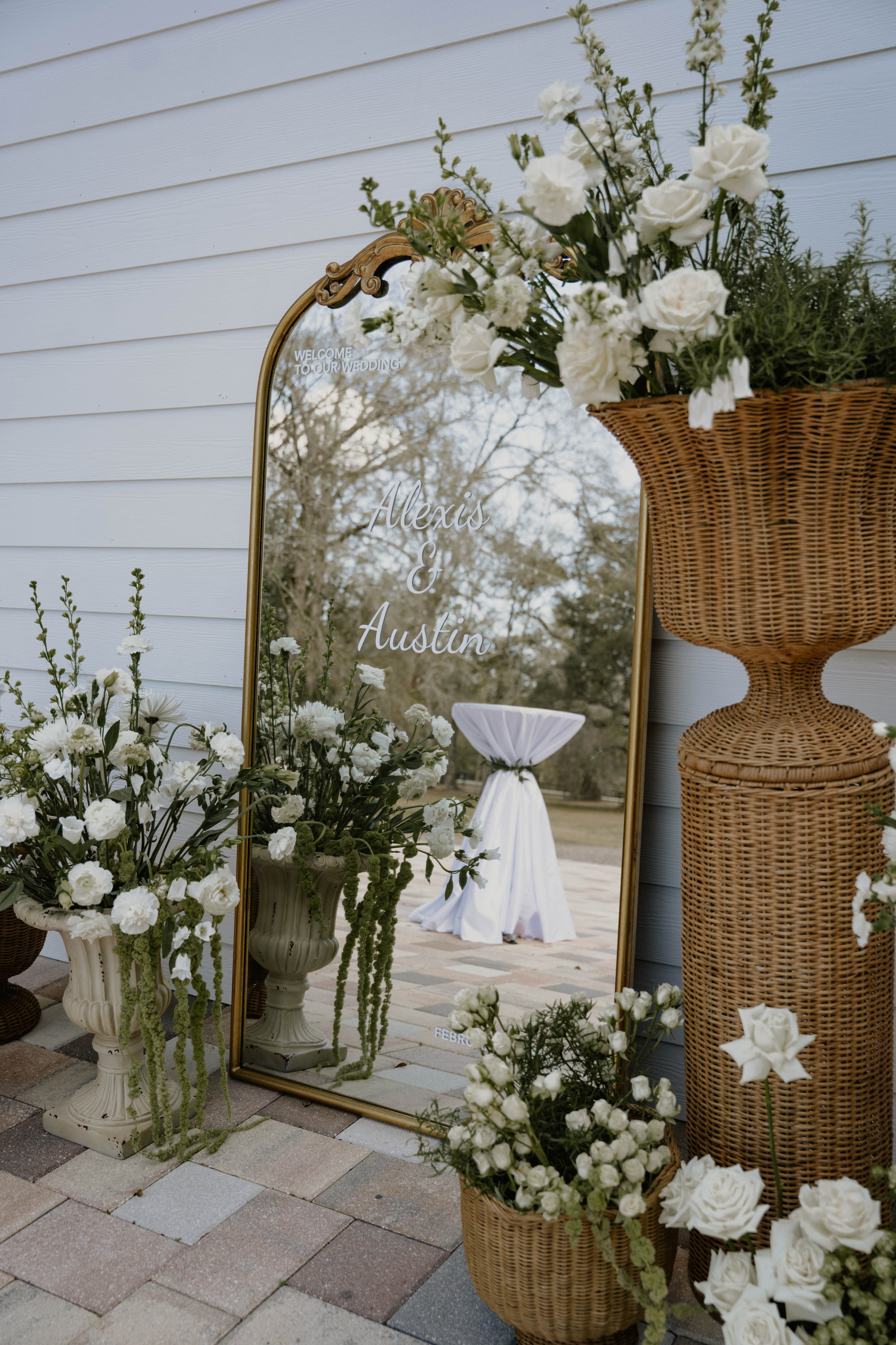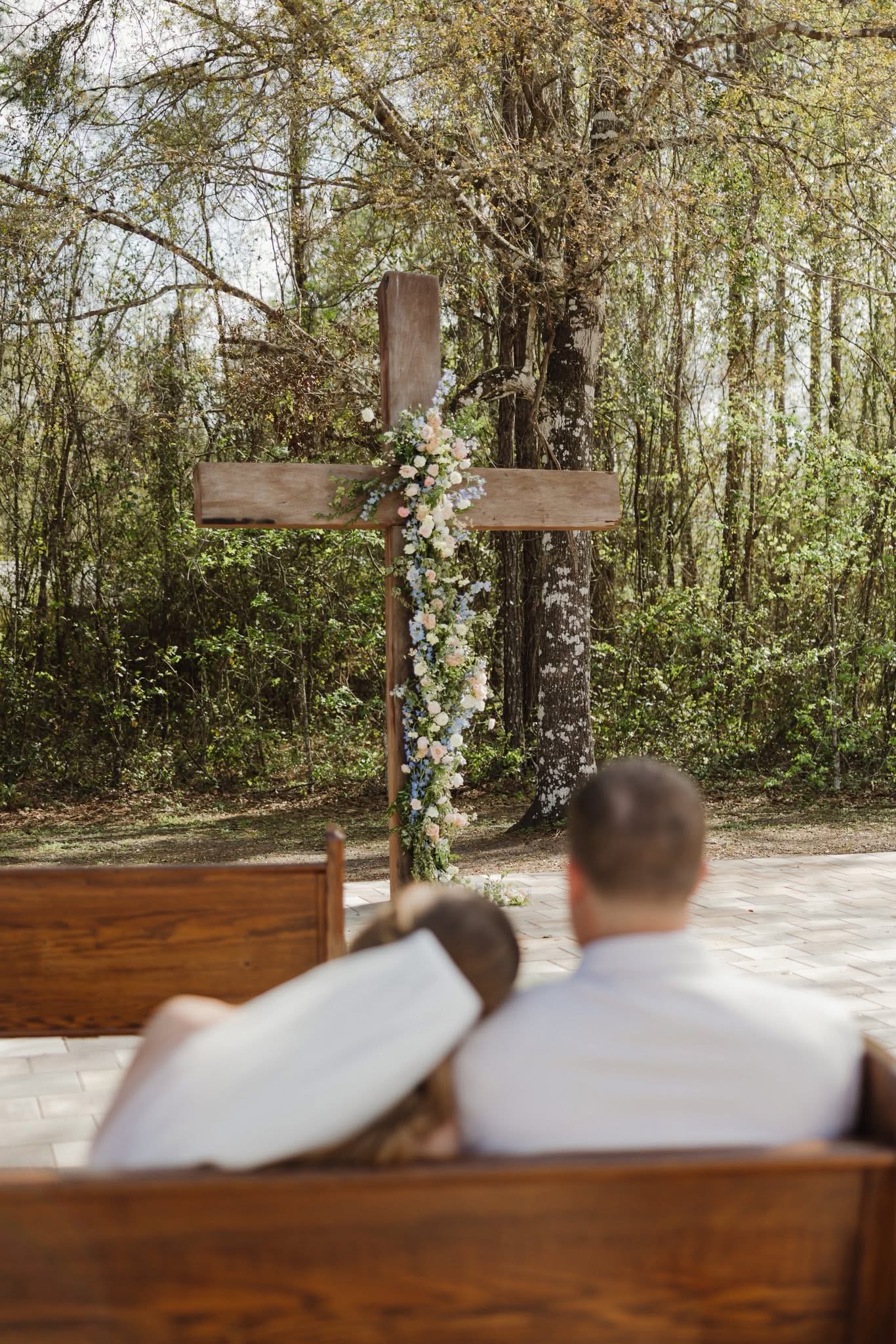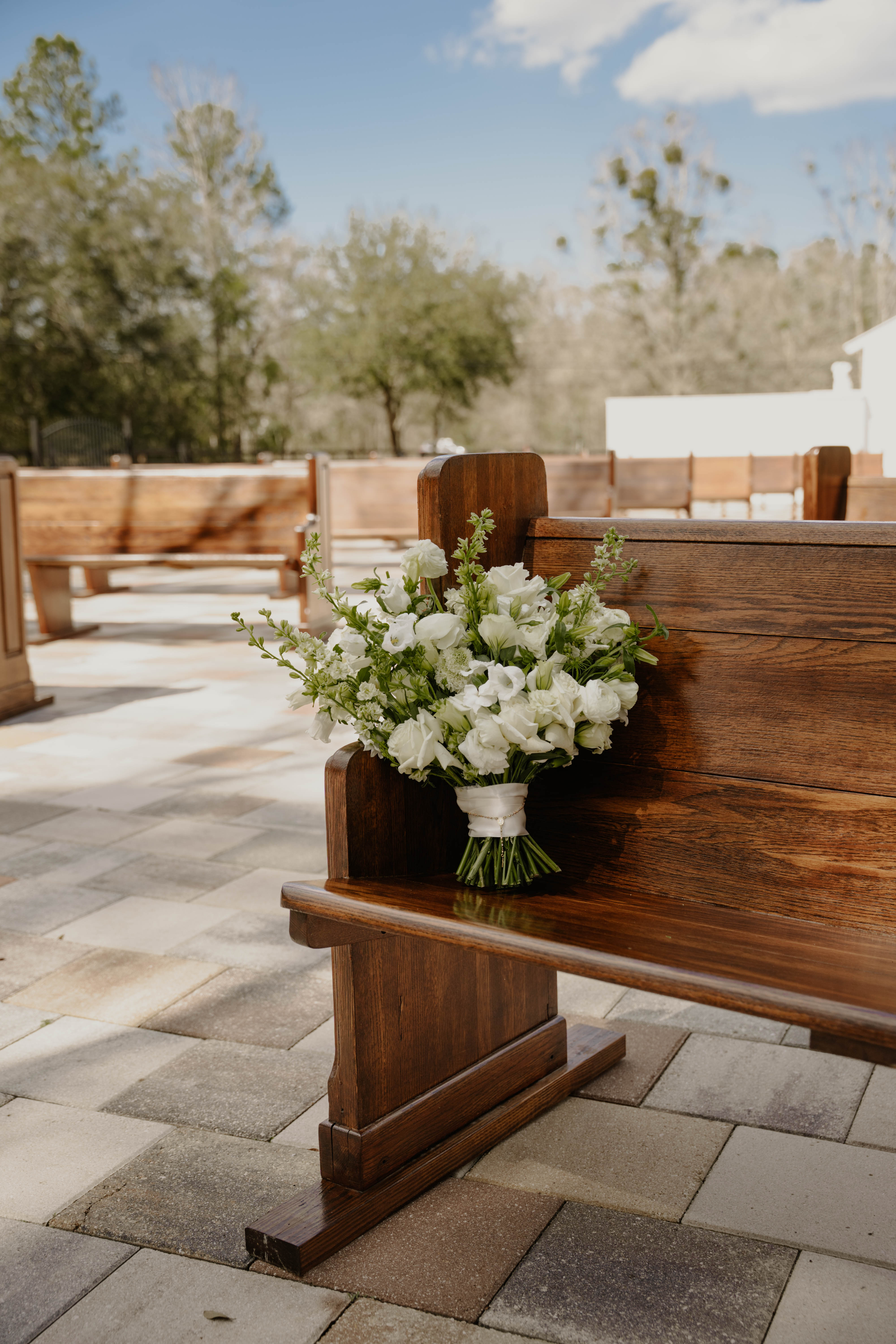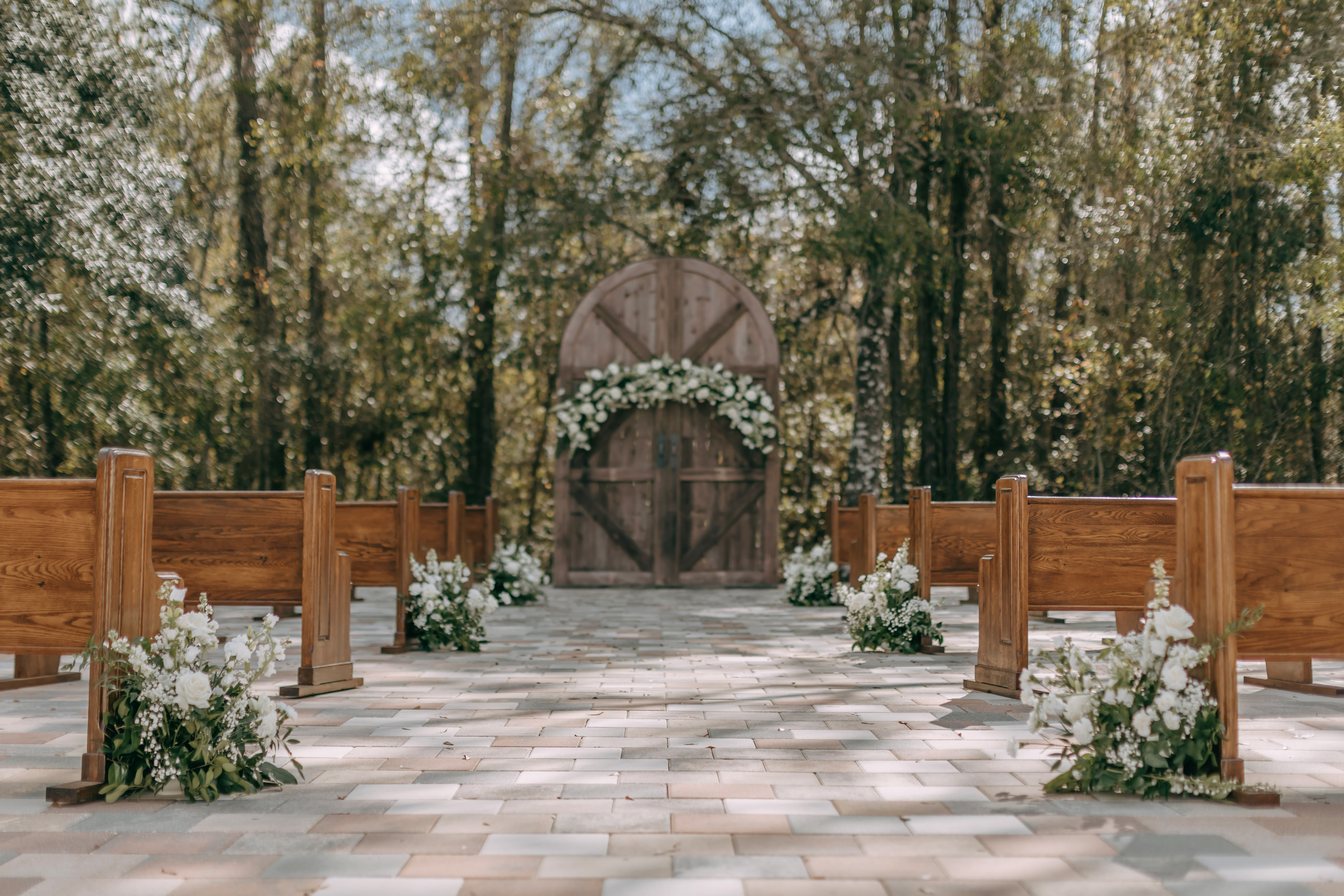 For Alexis & Austin, every detail was personal. A hand-built oak cross framed their ceremony, with vintage 100-year-old church pews and lush white-and-green blooms setting a soft, sacred feel. The bride arrived in a 1962 Ford truck, and guests gathered around curated charcuterie boards displayed on wicker, stone, and marble—warm, welcoming, and full of heart.