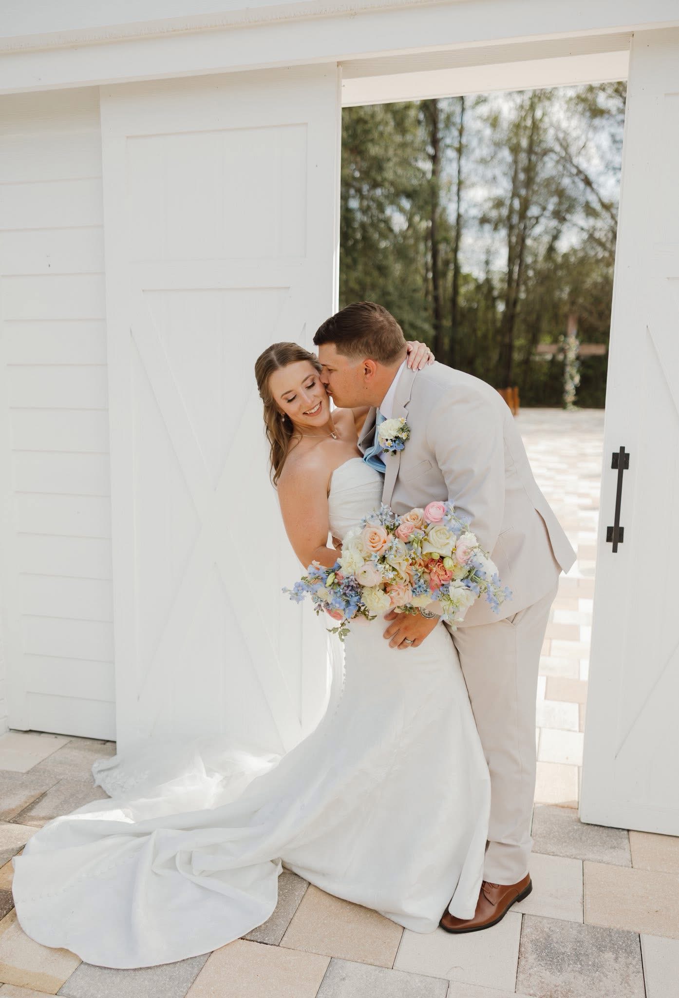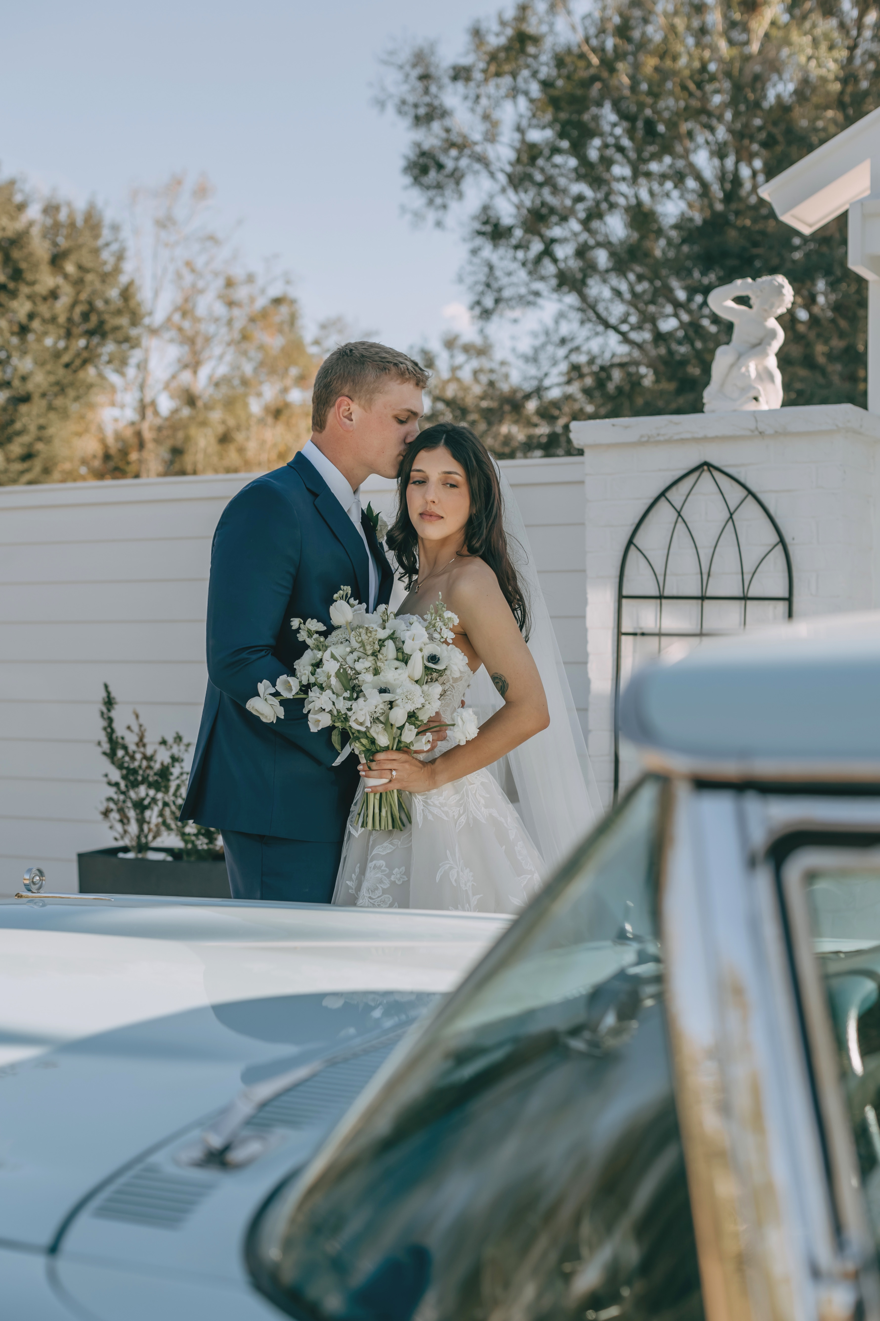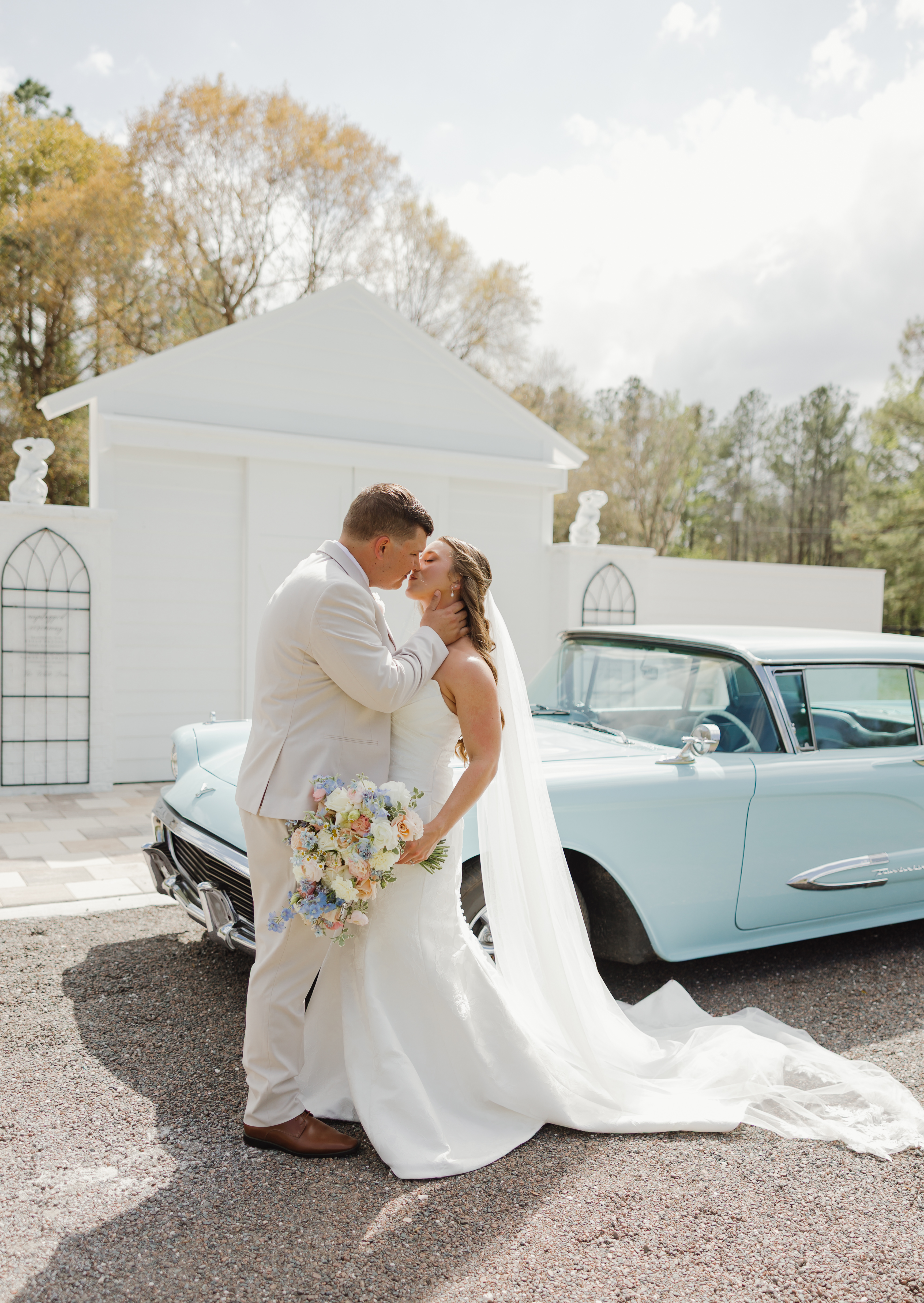 Amber & Nicholas’ wedding blended heirloom charm with soft spring color. A hand-built cross and 100-year-old church pews created a meaningful, historic setting, while a gold infinity circle and baby blue and peach florals added a modern, romantic touch. The bride arrived in a classic ’59 Thunderbird, setting the tone for a celebration that felt both timeless and fresh.