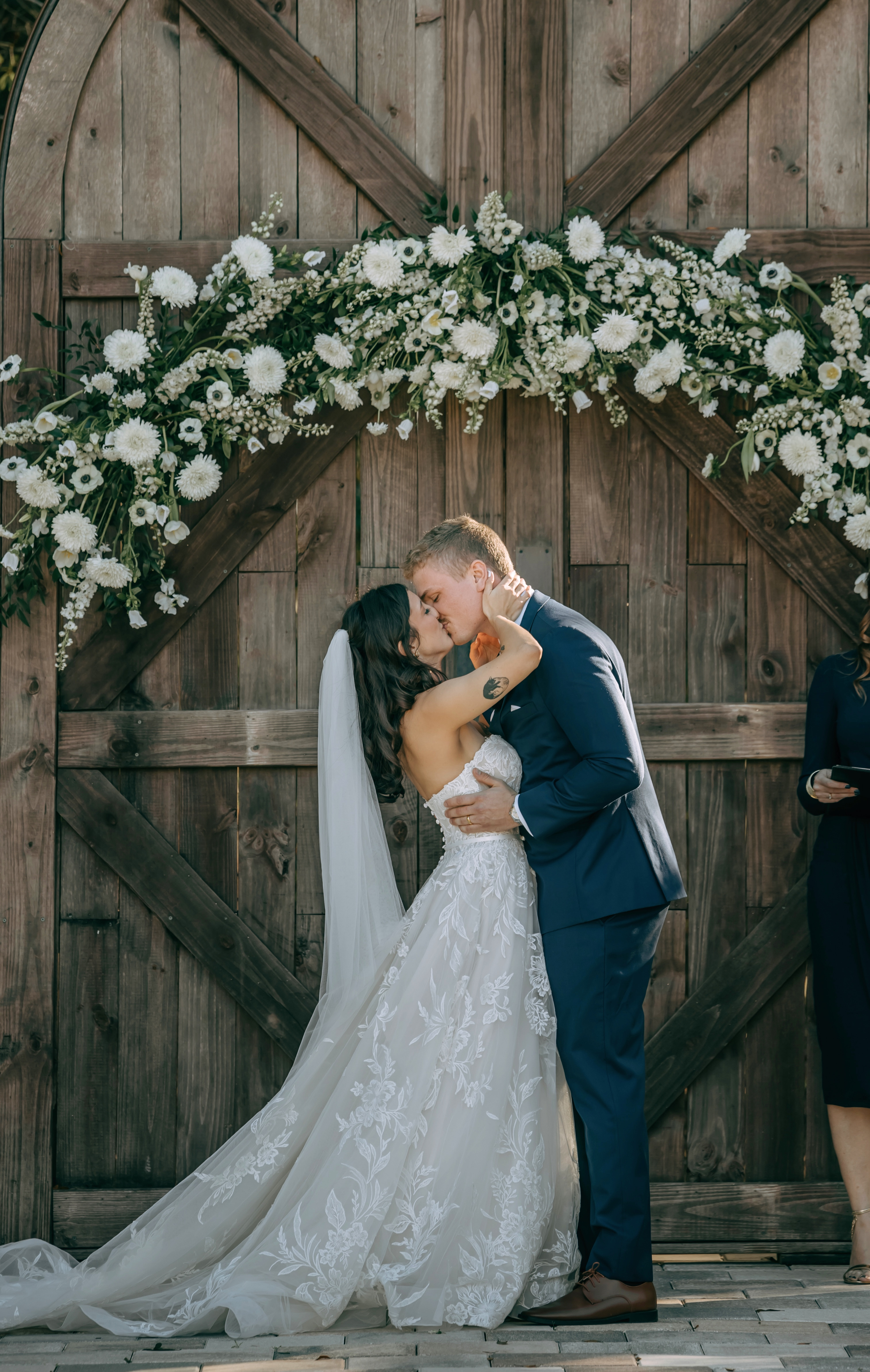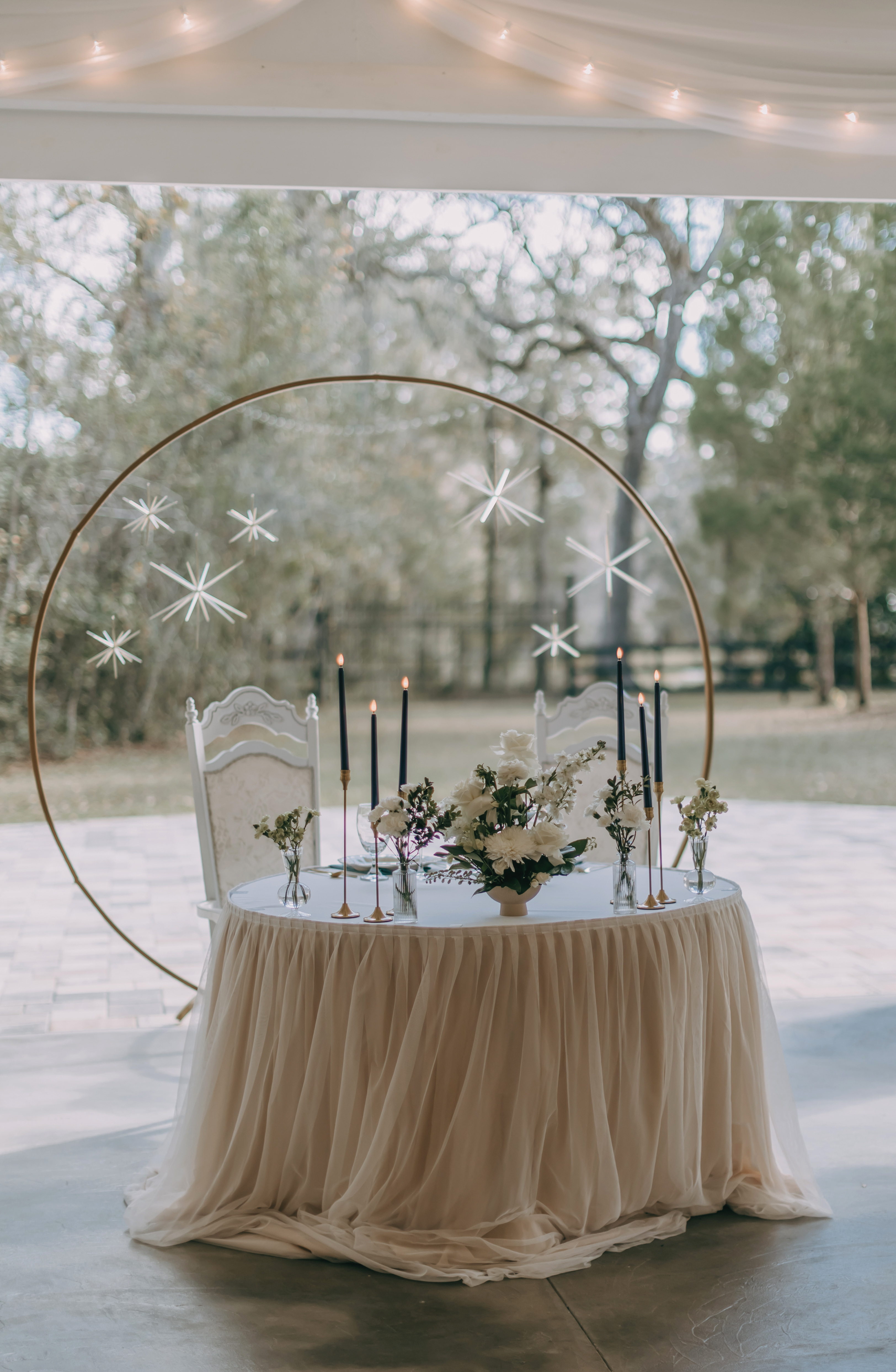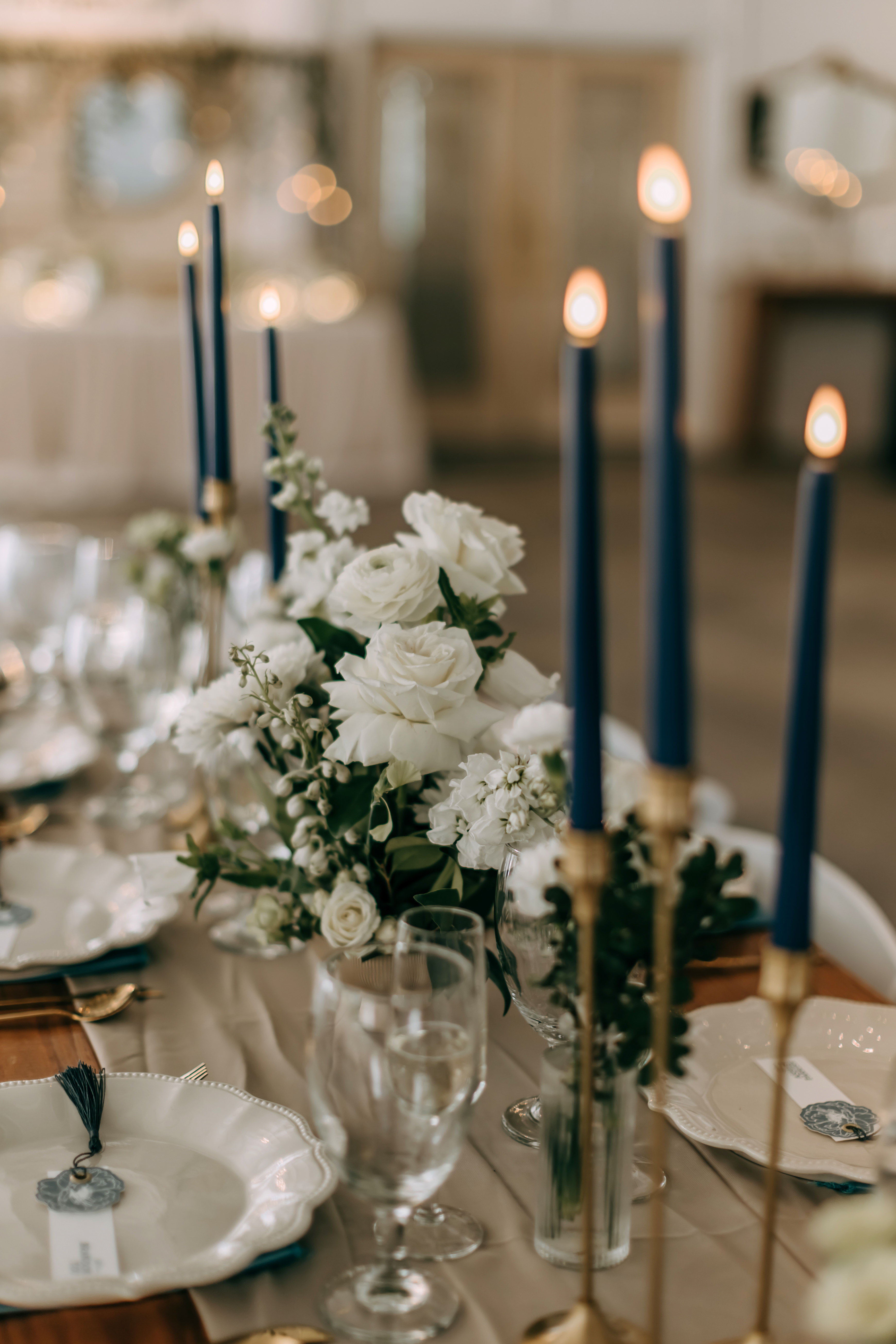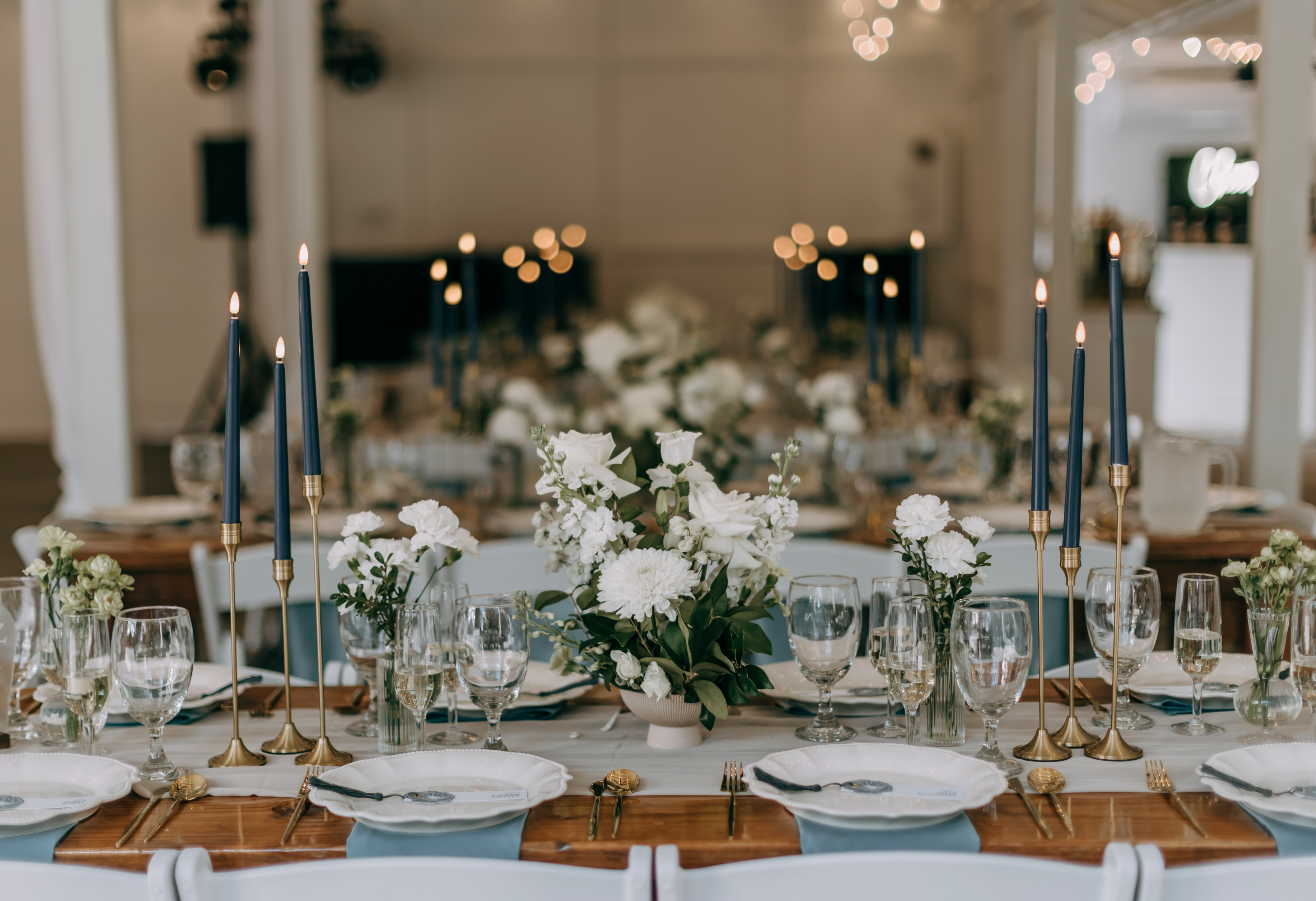Marla & Jacob imagined a moody, starry celebration, and every detail echoed that vision. An arched door backdrop set the scene for their vows, as a vintage ’59 Thunderbird delivered the bride and her father to the ceremony. The aisle was framed with grounded floral installs, tan compote vases, navy taper candles, and warm gold accents, wrapping the entire space in a soft, celestial glow.