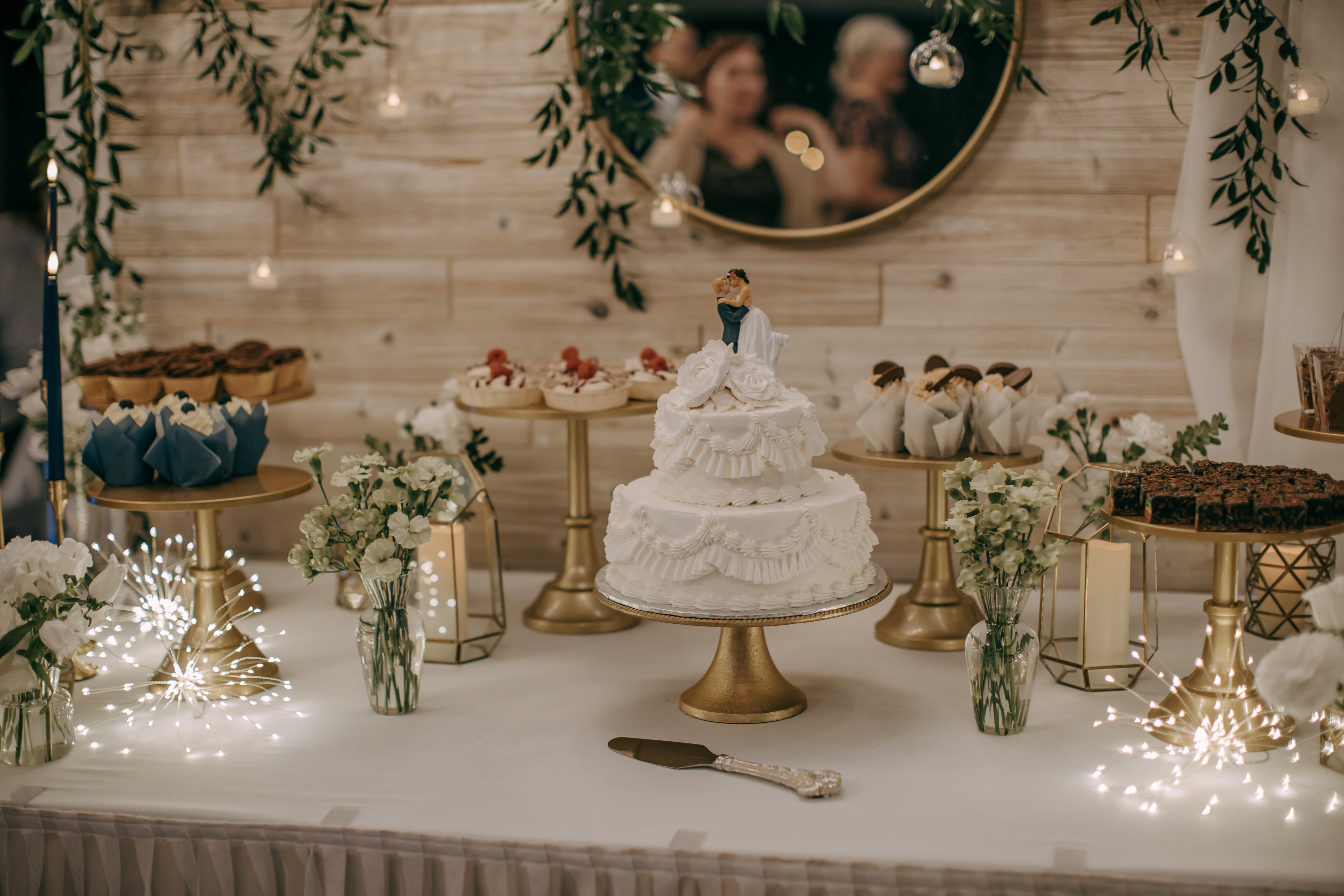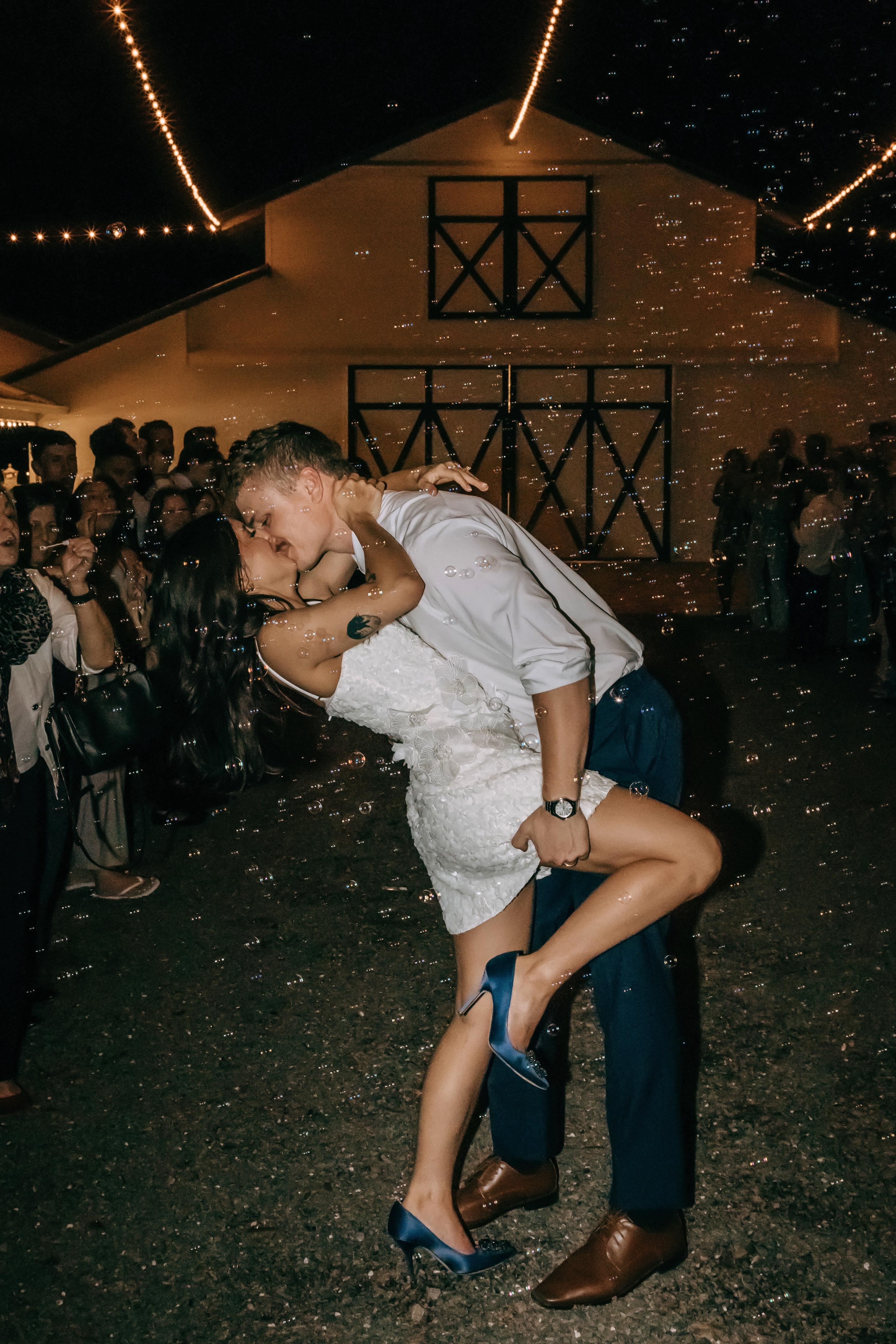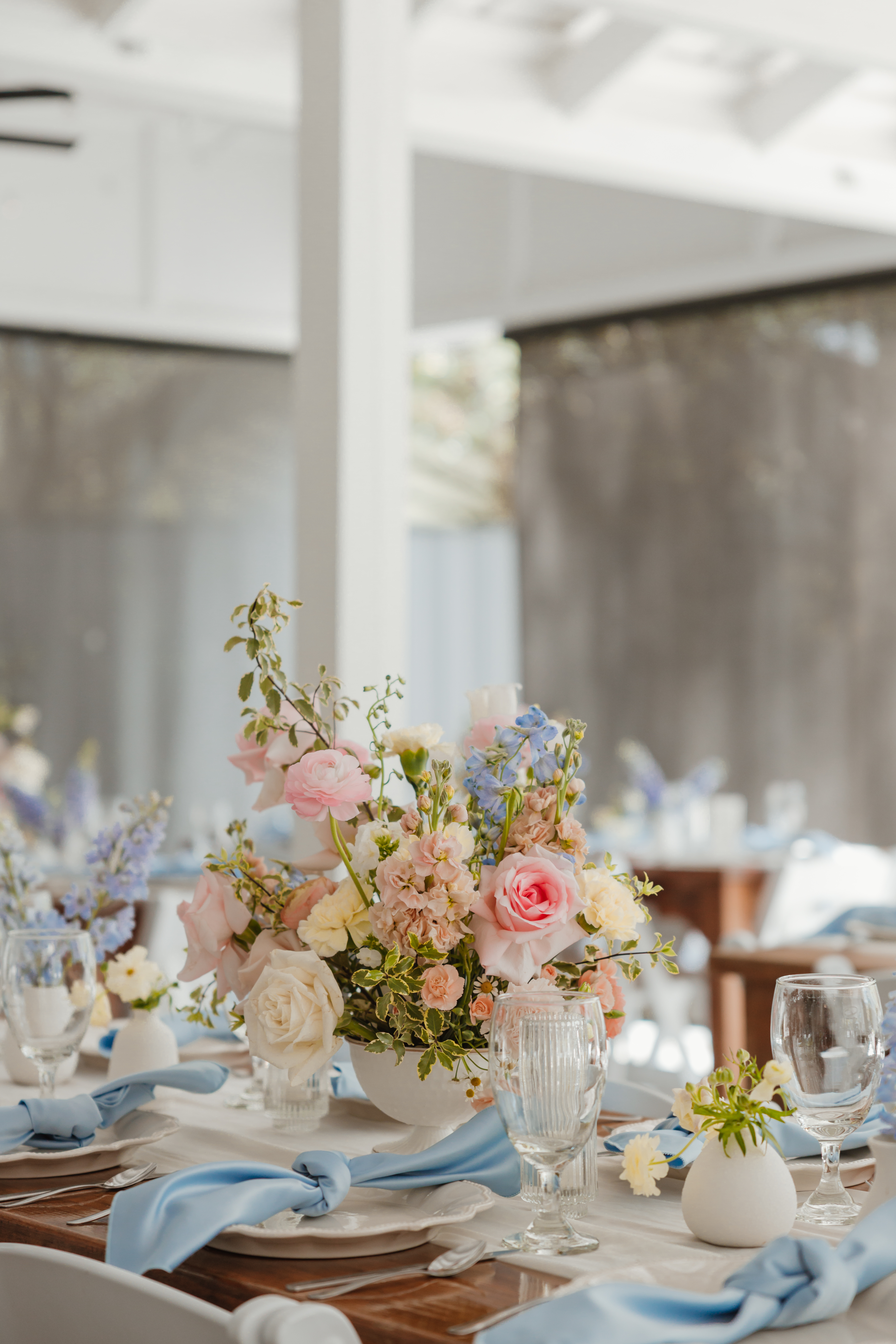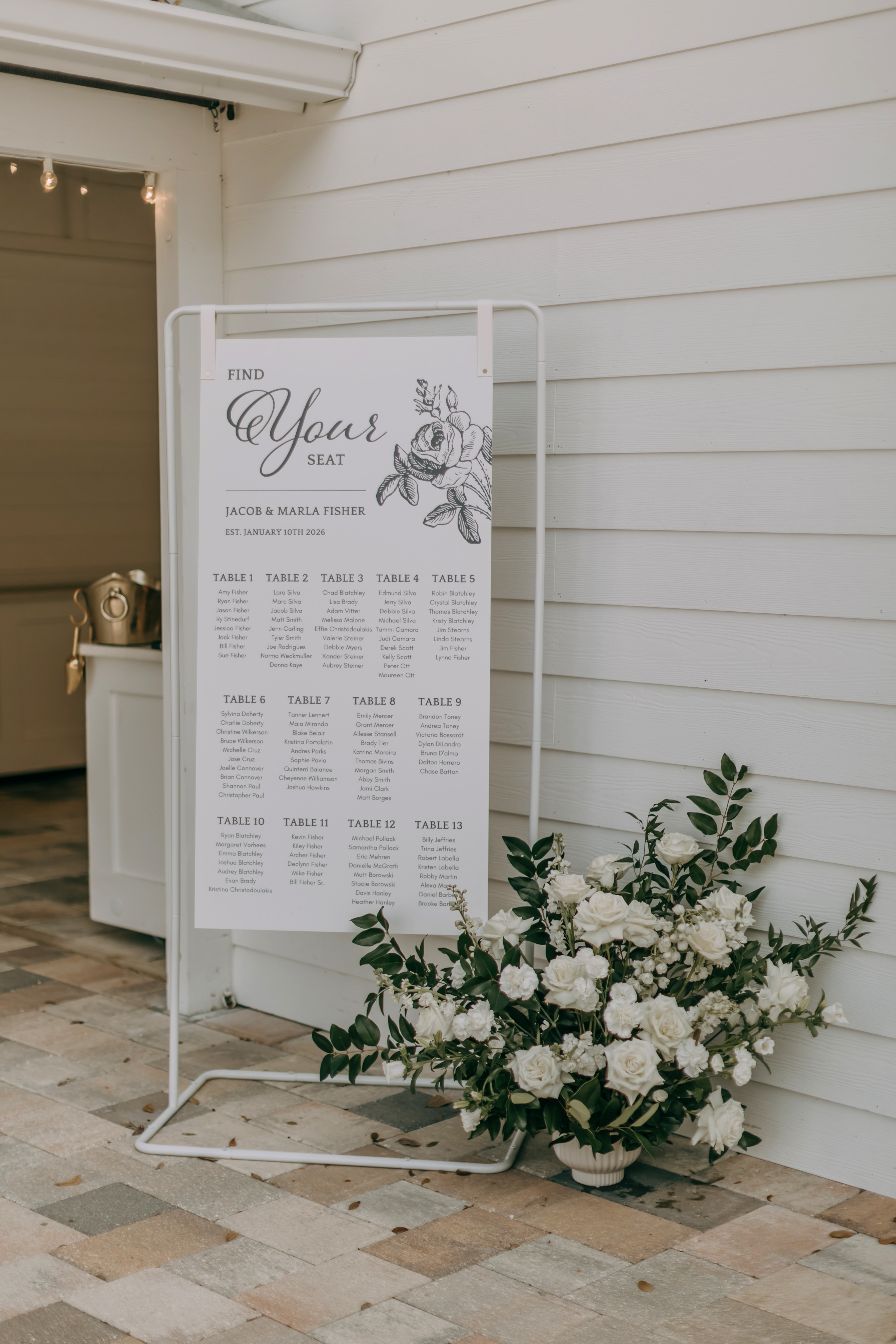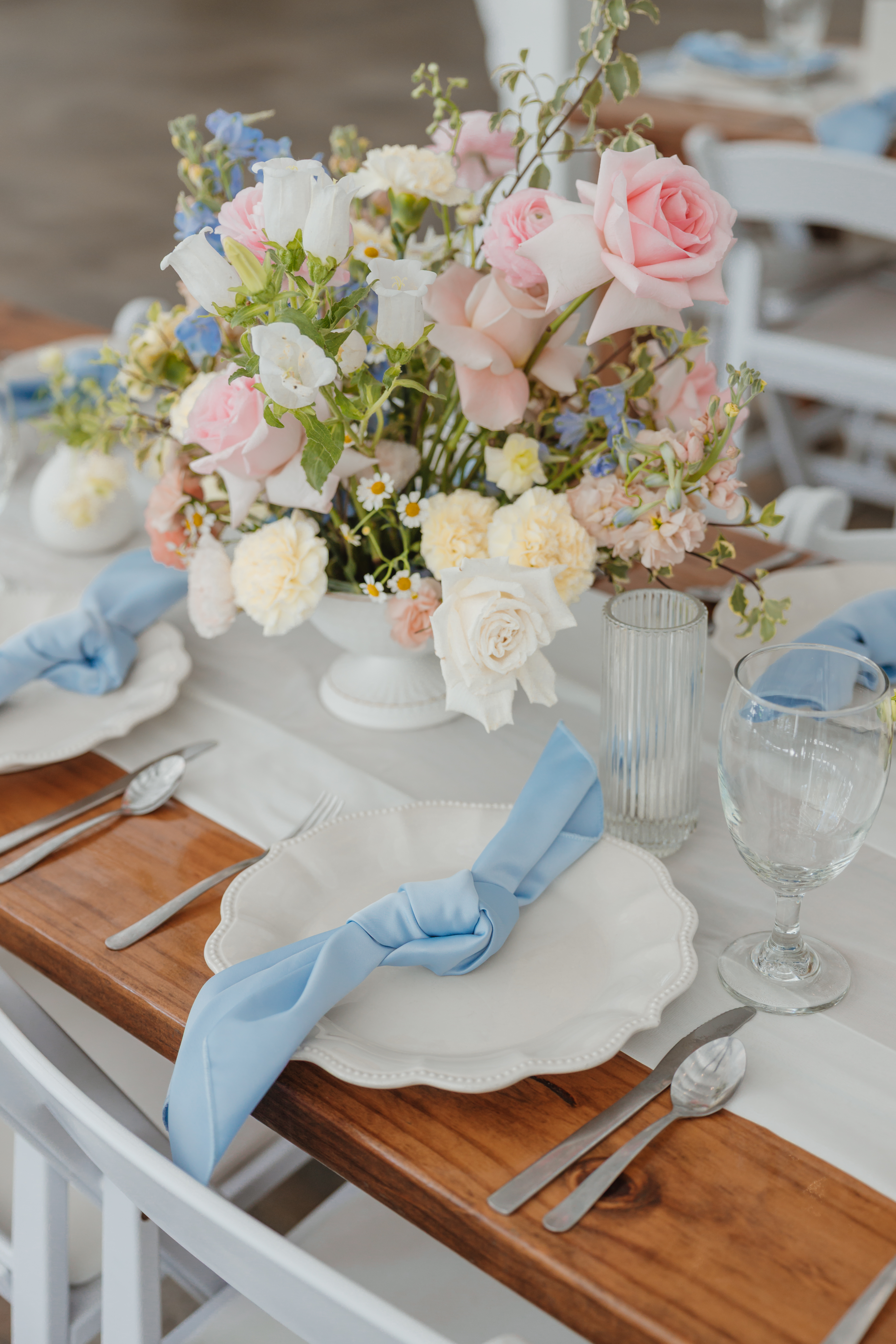 Marla & Jacob imagined a moody, starry celebration, and every detail echoed that vision. An arched door backdrop set the scene for their vows, as a vintage ’59 Thunderbird delivered the bride and her father to the ceremony. The aisle was framed with grounded floral installs, tan compote vases, navy taper candles, and warm gold accents, wrapping the entire space in a soft, celestial glow.